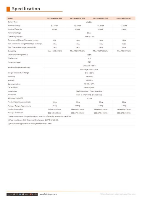 LUX-ED wall-mounted batteries with excellent performance, safety and convenient installation are the ideal solution for your energy needs. Whether for domestic, commercial or industrial use, the FLA series battery will easily meet your needs. The use of advanced LiFePO4 technology ensures that the battery has a higher energy density and longer life. There is no need to worry about low power or frequent replacement. The built-in intelligent BMS can monitor the status of the battery in real time to ensure that the battery is operating within a safe range. It is also equipped with multiple safety mechanisms, such as circuit breakers and fuses, to further enhance the safety of the battery. Batteries of different capacities can be combined depending on actual needs to meet different power requirements. The 51.2 V 250 Ah FLA battery has a capacity of 12.5 kWh.