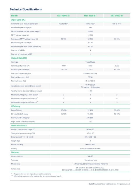 Nowej generacji mikroinwertery Hoymiles serii MIT zostały zaprojektowane tak, aby pomieścić osiem modułów fotowoltaicznych o dużej mocy, o mocy wyjściowej do 5000 VA i prądzie wejściowym do 20 A.