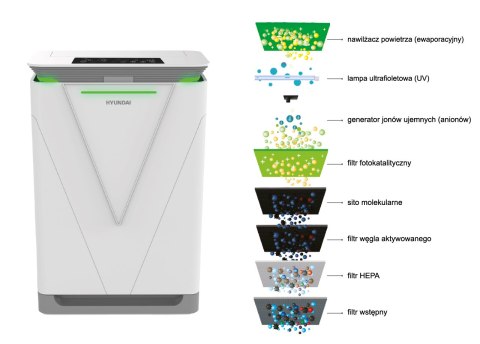 Oczyszczacz powietrza Hyundai PURIFY+ to nowoczesne rozwiązanie, które skutecznie zwalcza zjawisko smogu dzięki 80stopniowej filtracji powietrza. Dodatkowe funkcje jonizacji oraz ewaporacyjnego nawilżania pozwolą uzyskać zdrowe i czyste powietrze w pomieszczeniach, nawet do 80m².