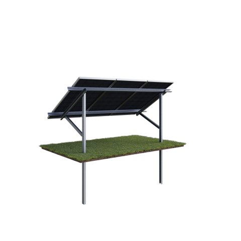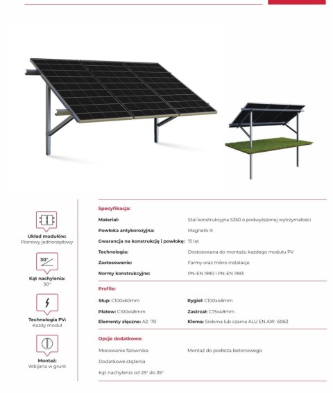 Stanowi samodzielną konstrukcję montażową na gruncie dla szeregu paneli fotowoltaicznych ułożonych pionowo, z nachyleniem około 25/30/35°.