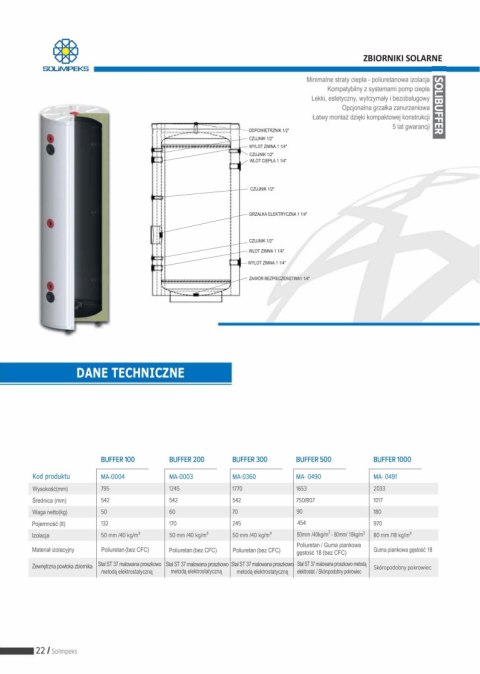 Die Pufferspeicher des Typs BUFOR sind zum Auffangen, Lagern, Erwärmen und Weiterleiten von überschüssigem Kessel-/Heizungswasser oder anderen Flüssigkeiten bestimmt, die für den Kontakt mit Kohlenstoffstahl zugelassen sind und aus verschiedenen Wärmequellen stammen: Zentralheizungskessel, Sonnenkollektoren, Wärmepumpen usw. Pufferspeicher dienen dem Schutz der Zentralheizungsanlage. - Sie übernehmen die Differenz zwischen der Wärmeleistung des Kessels und der in die Heizungsanlage abgegebenen Leistung. Der maximale Betriebsdruck des Speichers beträgt 0,3 MPa (ca. 3 bar).