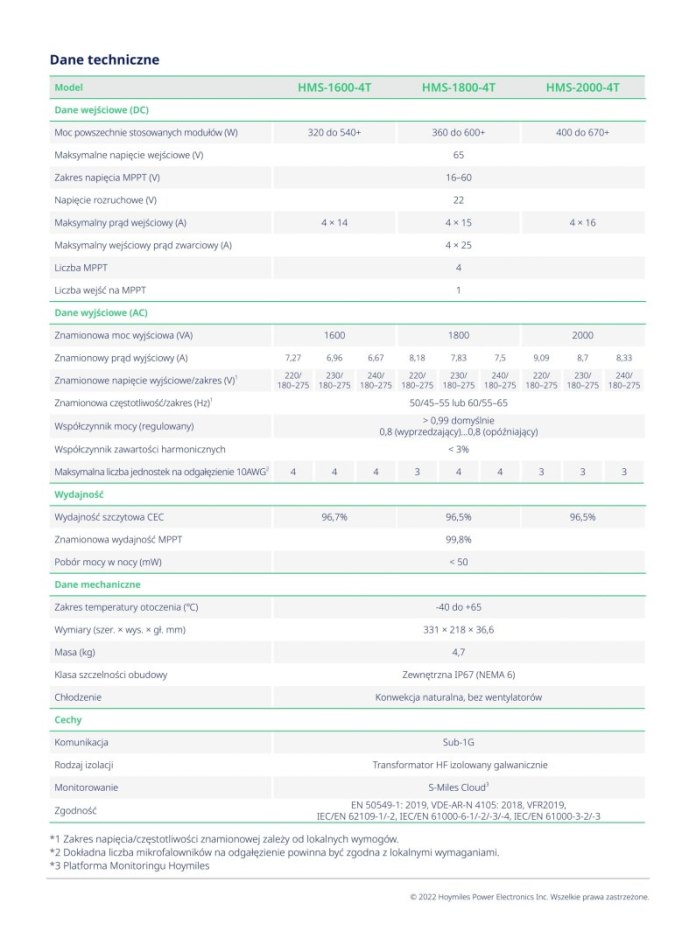 Osiągając moc wyjściową do 2000VA, nowy mikroinwerter Hoymiles HMS-2000 plasuje się w czołówce mikroinwerterów 4 w 1. Do każdego mikroinwertera można podłączyć nawet cztery moduły PV z niezależnym MPPT i monitorowaniem, co pozwala na większą wydajność energetyczną i łatwiejsze użytkowanie.