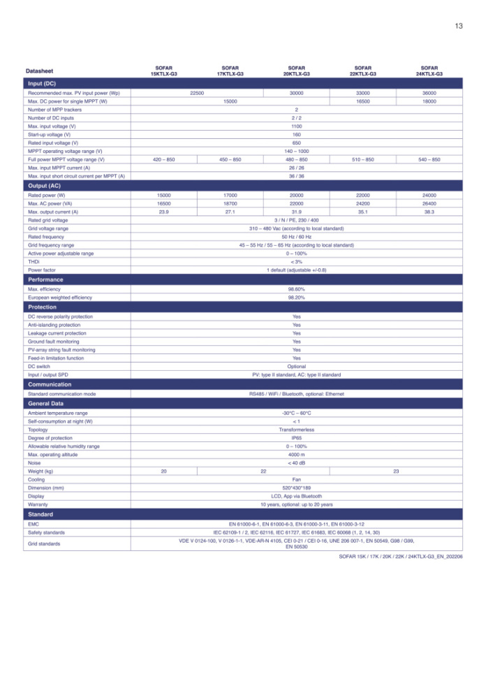 The SOFAR 24KTL-X-G3 three-phase inverter with dual MPPT has a maximum DC input voltage of 1100V, long-term overload capability of up to 110%, Type II SPD for DC and AC.