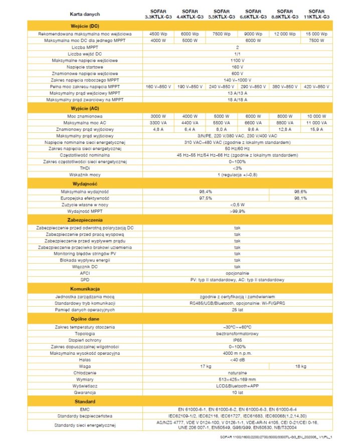 SOFAR 6.6KTL-X-G3 three-phase inverter has type II SPD for DC and AC current, intelligent string monitoring, and its maximum efficiency is 98.6%.The maximum input voltage of the inverter is DC 110V, and it also has a wide MPPT voltage range. One of the advantages is also natural cooling, no fans, quiet operation and remote software update.The devices are equipped with a WiFi module and have the ability to remotely control and monitor the operating parameters of the photovoltaic installation.